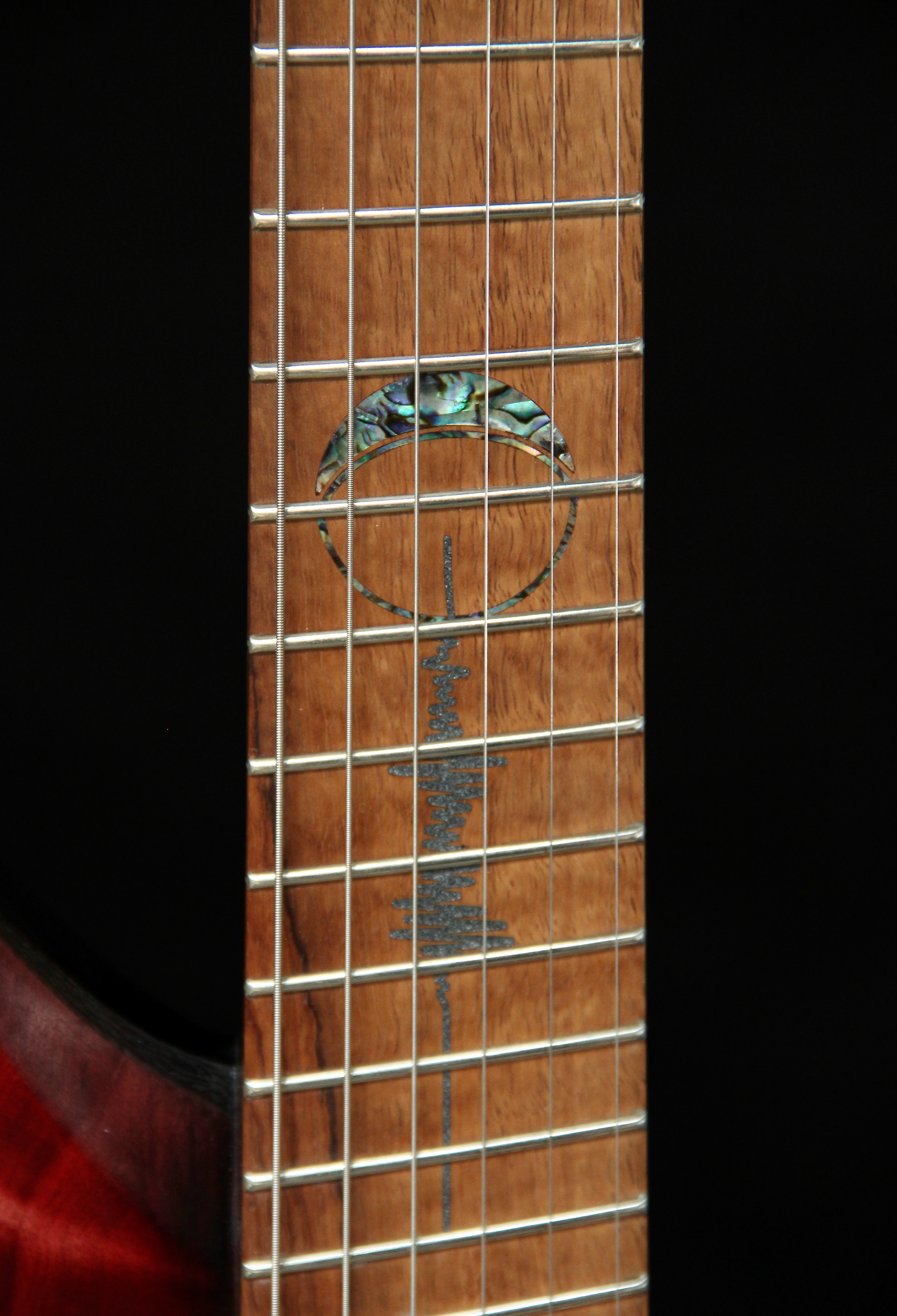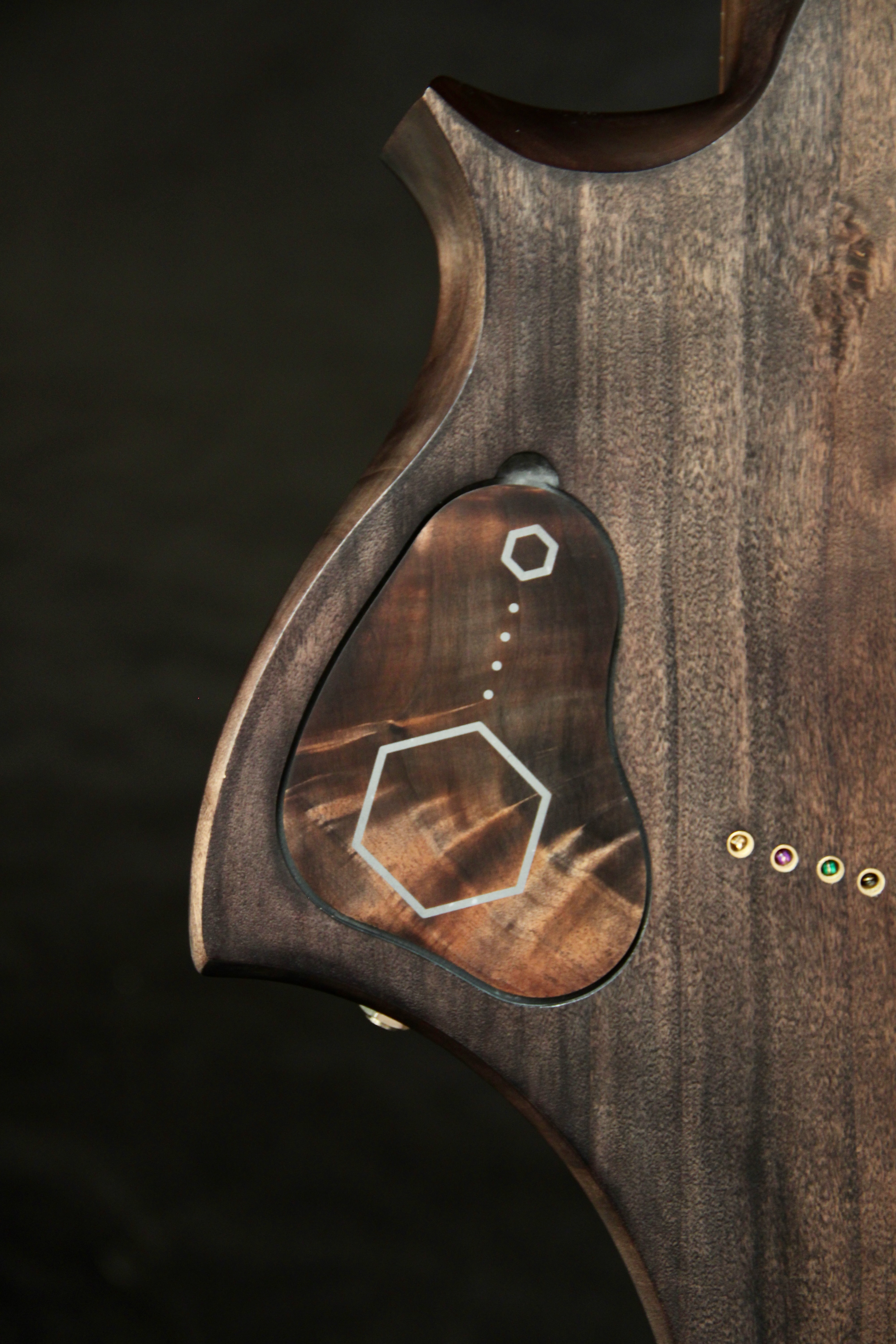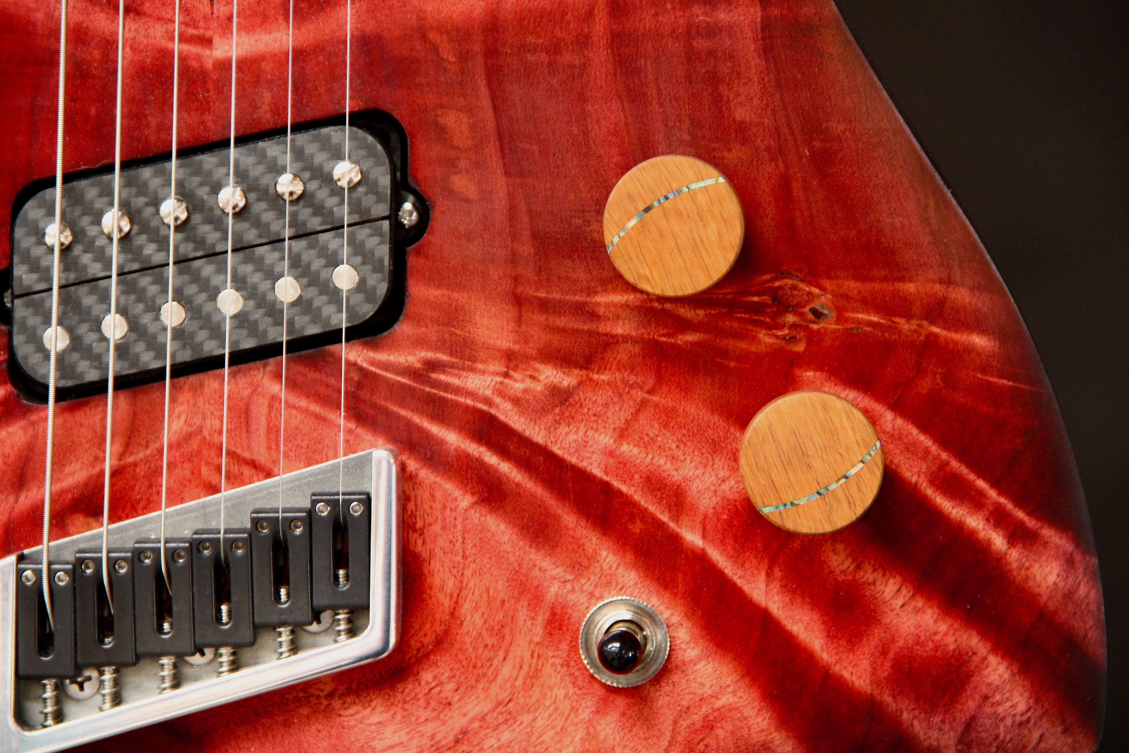 Black Willow figured top with Carbon fibre reinforcement on Black Willow back and set neck. Custom wound pickups, and milled bridge and custom inlayed knobs.