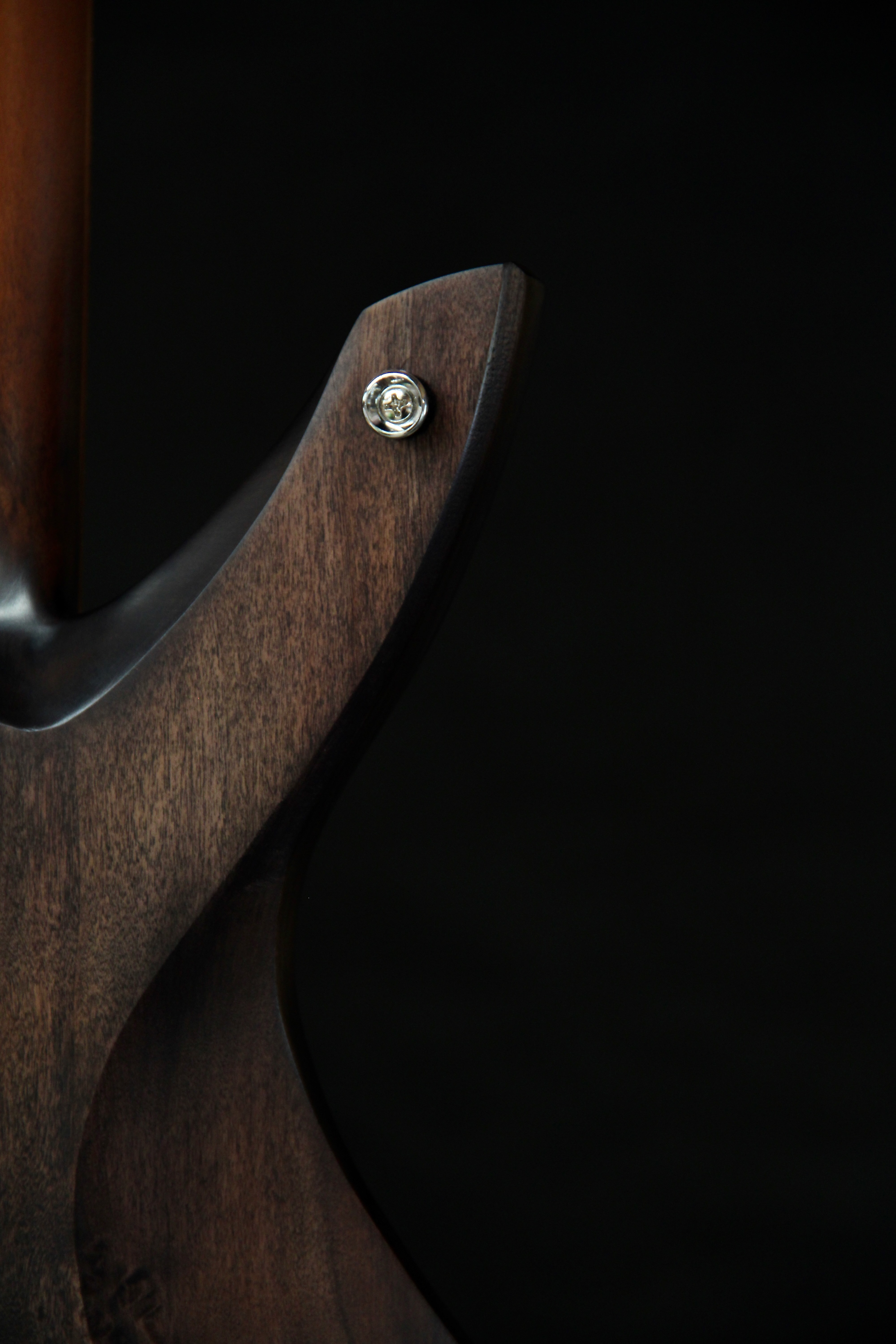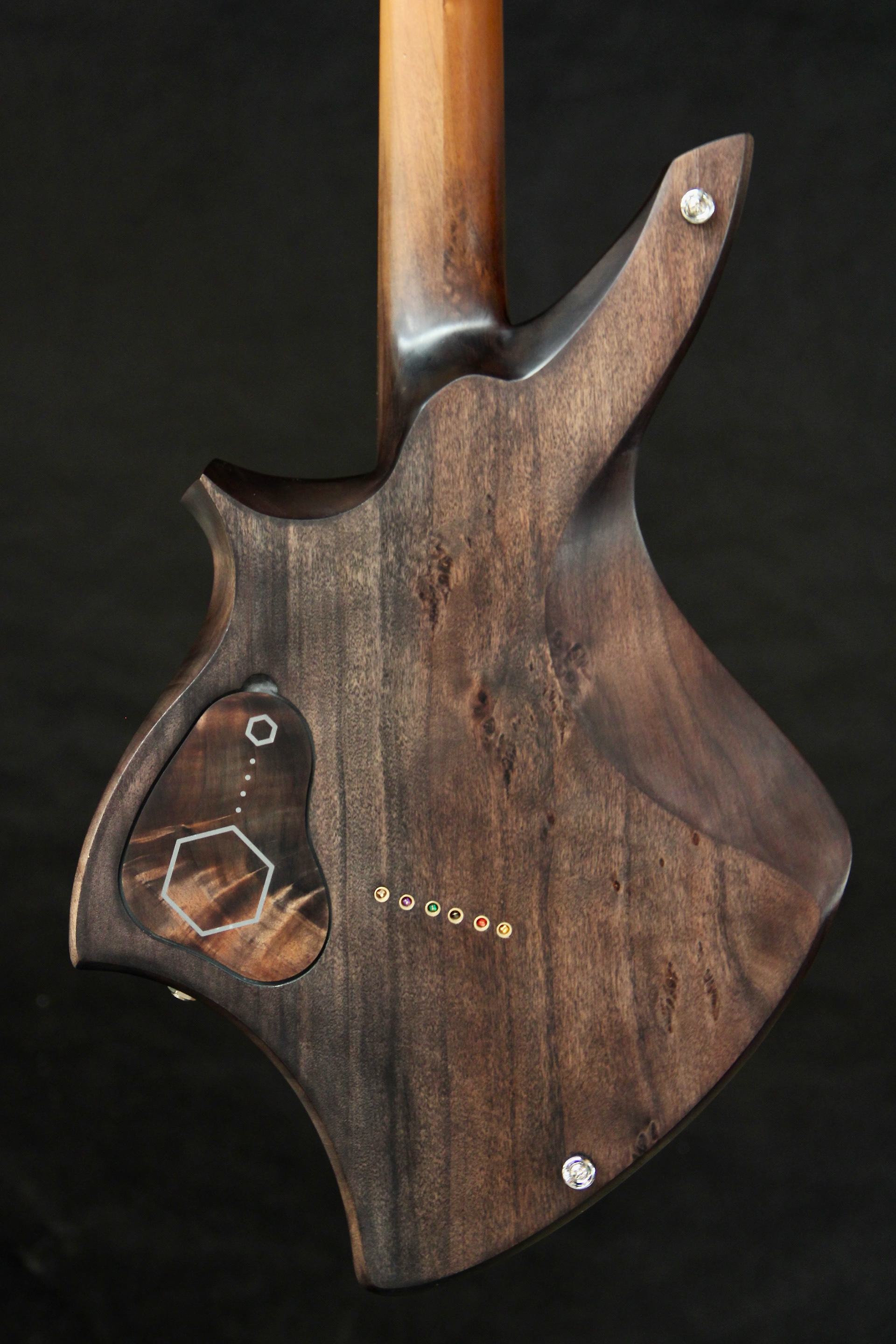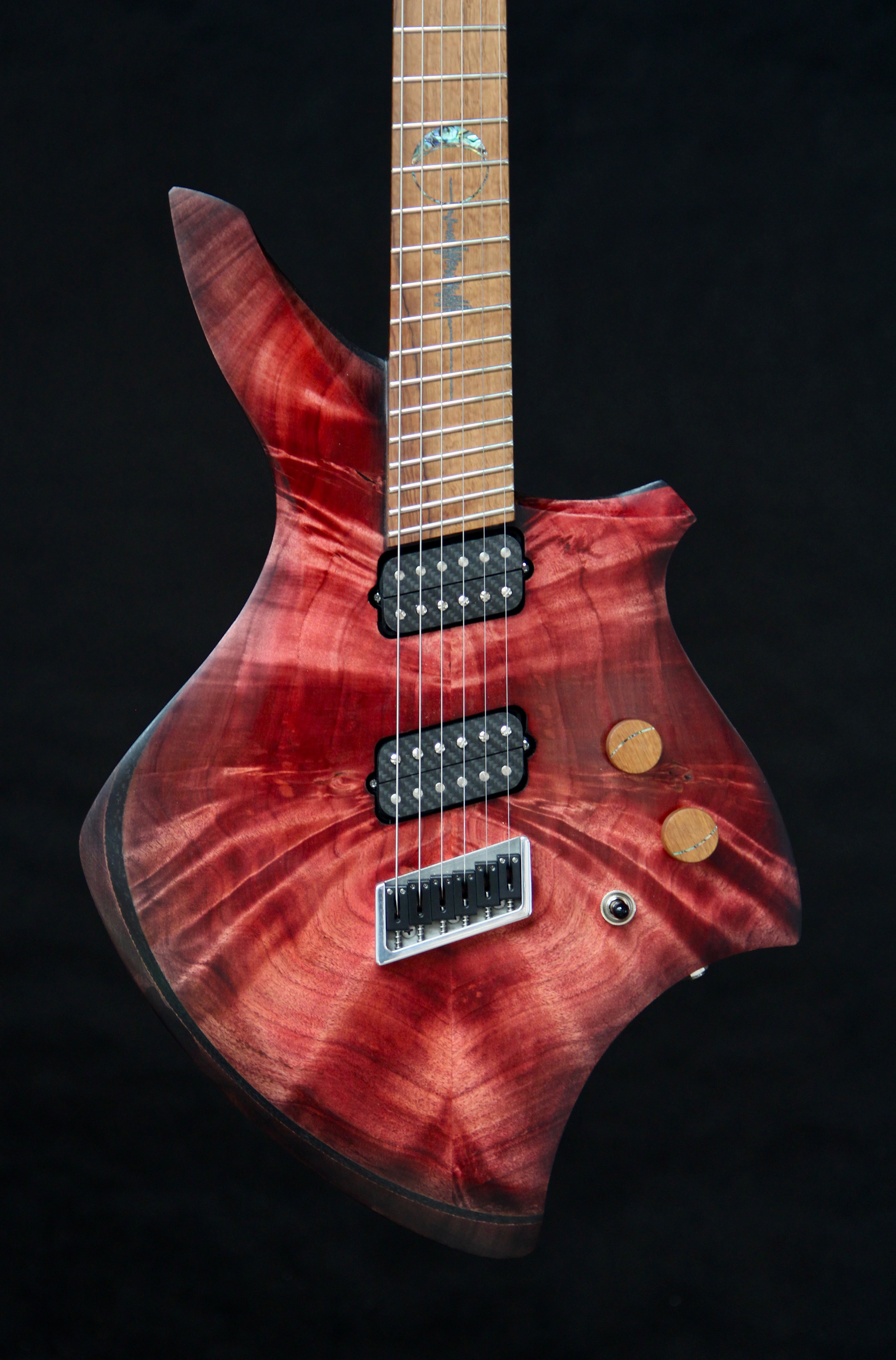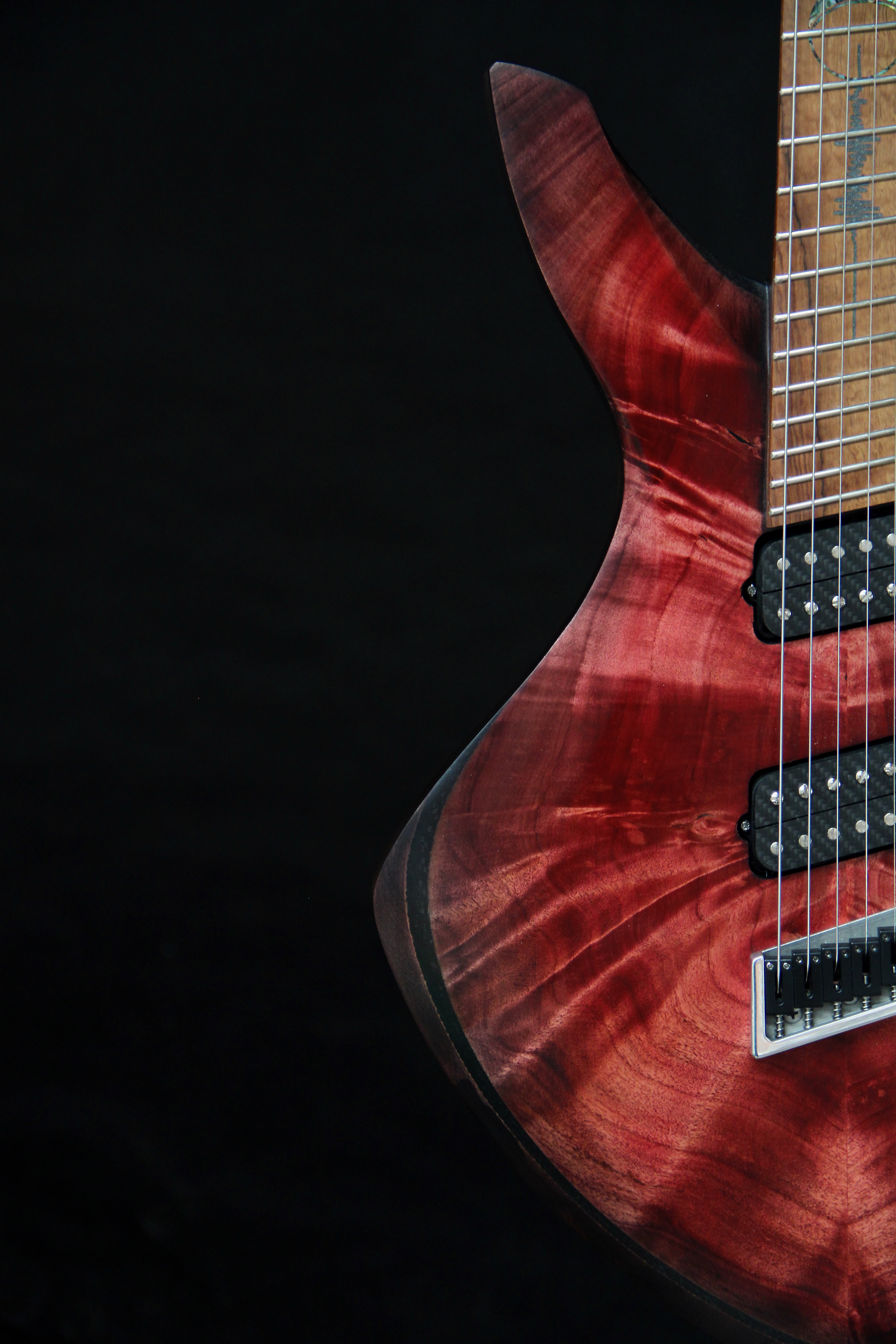 Black Willow figured top with Carbon fibre reinforcement on Black Willow back and set neck. Custom wound pickups, and milled bridge and custom inlayed knobs.